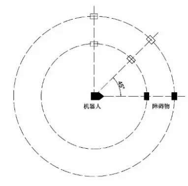 D. 將障礙物放置在相對于機(jī)器人的視線逆時(shí)針45°方向的直線上,重復(fù)步驟B和C。每次測量完成后,逆時(shí)針增加45°角,重復(fù)步驟D。當(dāng)機(jī)器人到達(dá)初始位置時(shí),程序停止。調(diào)整障礙物的方向,使其大的一面面向機(jī)器人。通過移動(dòng)機(jī)器人代替障礙物,可以實(shí)現(xiàn)障礙物的相對定位。