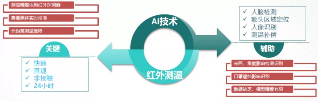 AI體溫檢測的關(guān)鍵在于紅外體溫。測溫精度不足,僅可對人員進行初篩;受環(huán)境因素影響較大,遠距離測溫?zé)o法解決;測溫精度修正成為AI未來的突破重點;相關(guān)技術(shù)和產(chǎn)品亟需制定標(biāo)準(zhǔn)規(guī)范。AI技術(shù)在復(fù)雜環(huán)境下的遠距離紅外測溫方向上仍需深耕。
