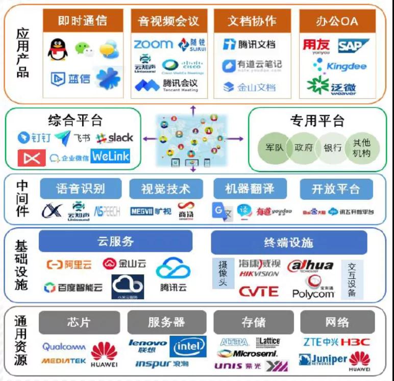 國內(nèi)在線辦公起步較晚,但發(fā)展迅速且產(chǎn)業(yè)鏈條完整,如圖23所示。國外在線辦公軟件起步較早,用戶付費意愿較G。受到疫情影響,國內(nèi)在線辦公受到熱捧,有望培養(yǎng)用戶習(xí)慣,并形成可持續(xù)的商業(yè)模式。據(jù)國外機構(gòu)Apps Run The World數(shù)據(jù),2018年排名前10位的協(xié)作軟件供應(yīng)商占協(xié)作整體市場的55.7%,其中微軟以占L20.8%的市場份額L跑市場,其次是思科、谷歌、LogMein和Slack。我國協(xié)同辦公市場規(guī)模也呈逐年擴大趨勢,據(jù)不完全統(tǒng)計,國內(nèi)提供協(xié)同辦公產(chǎn)品的企業(yè)約有500余家,2019年產(chǎn)業(yè)規(guī)模達到459.5億元。即時通訊:國內(nèi)互聯(lián)網(wǎng)公司技術(shù)和市場成熟;微信、釘釘、飛書、藍信等處于L先地位。音視頻會議:Zoom和思科Webex占據(jù)龍頭地位;國內(nèi)飛書、釘釘?shù)燃闪藭h功能,也有專注視頻會議的隨銳、全視通等。文檔協(xié)同:微軟憑借office軟件在占據(jù)著先發(fā)優(yōu)勢;金山得益于WPS office 的深耕,市場占有率逐步提G。辦公OA:國內(nèi)辦公OA歷史較長,主要企業(yè)包括用友、SAP、金蝶、金和、致遠互聯(lián)、泛微等。適應(yīng)國內(nèi)習(xí)慣和需求,本土企業(yè)優(yōu)勢明顯。