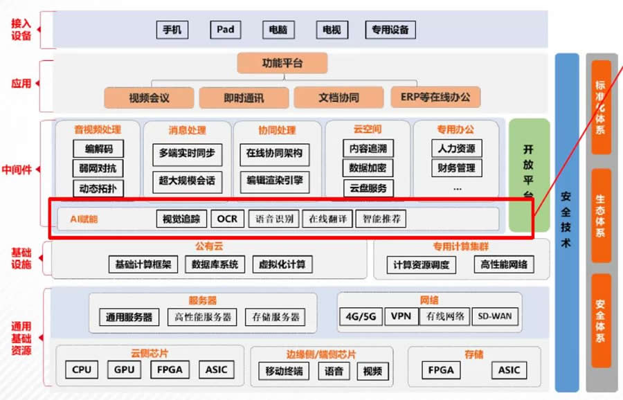 AI賦能協(xié)同辦公系統(tǒng),如圖22所示,提升辦公軟件性能。AI技術(shù)主要是讓在線辦公系統(tǒng)更加智能,提供更出色的用戶體驗。網(wǎng)絡(luò)質(zhì)量預(yù)測。用于動態(tài)調(diào)整網(wǎng)絡(luò)拓撲、編碼方式等,保證通信質(zhì)量。人臉識別技術(shù)驗證身份,提升會議系統(tǒng)的安全性。對視頻質(zhì)量進行動態(tài)改善,提升交流體驗。利用語音識別和翻譯技術(shù),實現(xiàn)會議字幕生成和翻譯。AI在協(xié)同辦公軟件中可發(fā)揮的作用有待進一步挖掘。
