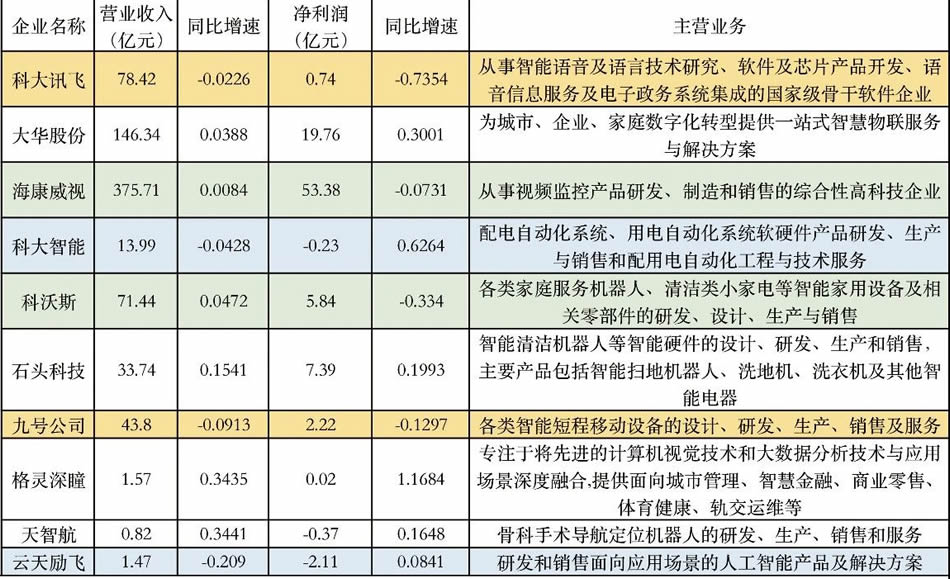 依然以營收和凈利潤兩個指標(biāo)來界定,4家雙增的企業(yè)有大華股份、石頭科技、格靈深瞳、天智航;2家雙降的企業(yè)有科大訊飛、九號公司;4家單降的企業(yè)有?低、科大智能、科沃斯、云天勵飛。