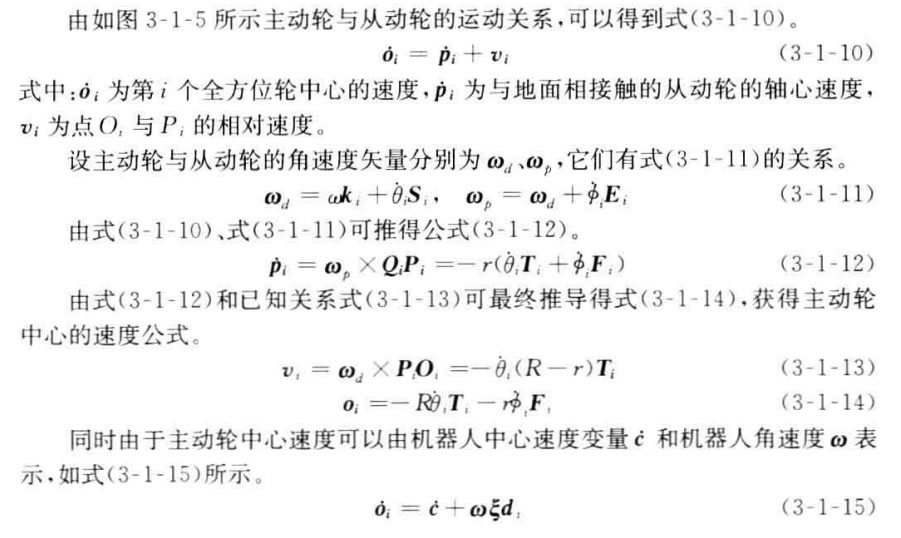 具有傳統(tǒng)車輪的機(jī)器人只能有兩個(gè)自由度的運(yùn)動(dòng),所以在運(yùn)動(dòng)學(xué)上,它等價(jià)于 傳統(tǒng)的陸上車輛。然而,具有全方位輪的機(jī)器人有3個(gè)自由度運(yùn)動(dòng)的能力,即沿著 平面上x 軸、y 軸以及繞自身中心旋轉(zhuǎn)的運(yùn)動(dòng)能力,這充分增加了機(jī)器人的機(jī)動(dòng) 性。本節(jié)將給出這種全方位移動(dòng)機(jī)器人的運(yùn)動(dòng)學(xué)模型。