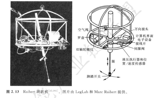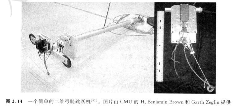 圖2.14表示的是Z近研制開發(fā)的更高效能的結(jié)構(gòu)[83,它利用了設(shè)計(jì)良好的機(jī)械 動(dòng)力學(xué)83。它不用外裝的液壓泵供給能量,而是設(shè)計(jì)了弓腿跳躍機(jī),當(dāng)它著地時(shí),利 用一根有效的弓形彈簧腿來獲得機(jī)器人的動(dòng)能。這個(gè)彈簧返回了幾乎85%的能量, 這就意味著每次只需要添加所需能量的15%即可穩(wěn)定跳躍。這個(gè)機(jī)器人用支架沿軸 受到約束,用裝在機(jī)器人上的一組電池,已經(jīng)展示能連續(xù)跳躍20 min 。和 Raibert 跳 躍機(jī)一樣,弓腿跳躍機(jī)通過在髖關(guān)節(jié)改變相對(duì)于身體的腿角來控制速度。