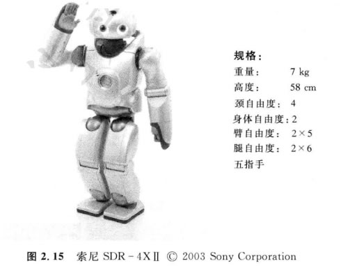 索尼夢想機器人,即SDR-4X Ⅱ模型,如圖2.15所示。這個流行的模型是1997 年開始的研究結(jié)果,它以運動表演和交際娛樂(如跳舞和唱歌)為基本目的。這個具 有38個自由度的機器人,為了聲音的精細定向、基于圖像的人員識別、單板微型立體 景深圖的重構(gòu)以及有限的語音識別,裝有7個麥克風(fēng)。給定了流媒體和娛樂運動的 目標,索尼公司花費了巨大的精力設(shè)計了運動的原型應(yīng)用系統(tǒng),它能使他們的工程師 以簡捷的方式編排舞蹈。要注意的是,SDR-4XI 比較小,站立58cm, 重量僅6.5kg。