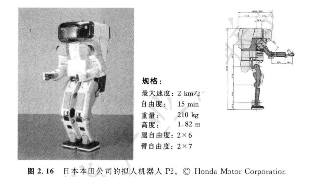 本田公司的擬人機器人項目有著值得注意的發(fā)展經(jīng)歷。但是此外,它還抓住了 激勵的非常重要的工程挑戰(zhàn)。圖2.16展示了模型 P2, 它是Z新模型 Asimo (在發(fā)明 移動性中有超前步伐)Z直接的先驅(qū)。注意,Z新的本田 Asimo 模型仍然比 SDR- 4X I大得多,高120 cm, 重52 kg 。這可在保持不危險尺寸和姿勢的同時,能在有樓 梯和臺階的人類環(huán)境中具有實用的機動性。也許這是展示仿生的雙腳上下樓梯的第 一個機器人。這些本田擬人系列的機器人不是專門為娛樂目的而設(shè)計,而是作為整 個社會的人類幫手而設(shè)計。例如,本田公司把Asimo 的高度當作機器人能對人類環(huán) 境進行管理操作(如控制燈開關(guān))的Z小高度。