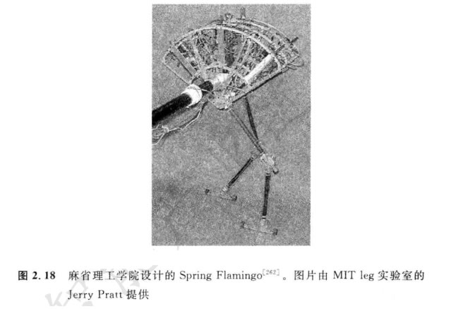 雙腳機器人只能在某些限制內(nèi)靜態(tài)地穩(wěn)定。因此,像P2 和WABIAN-2R 這樣的 機器人即使站著不動,通常也需要連續(xù)地進行伺服平衡校正。而且,各條腿都需要有足 夠的容量以支撐機器人全部重量。在四腿機器人情況下,平衡問題隨各條腿上的負荷 需求而變得容易解決。雙腿機器人的 一個 出色設(shè)計是麻省理工學(xué)院設(shè)計的Spring Fla- mingo (圖2. 18)。這個機器人與腿激勵器相連,插入了彈簧,實現(xiàn)更有彈性的步態(tài)。通過與限制膝蓋關(guān)節(jié)角度的“膝蓋骨”相結(jié)合,F(xiàn)lamingo 實現(xiàn)了驚人的仿生運動。