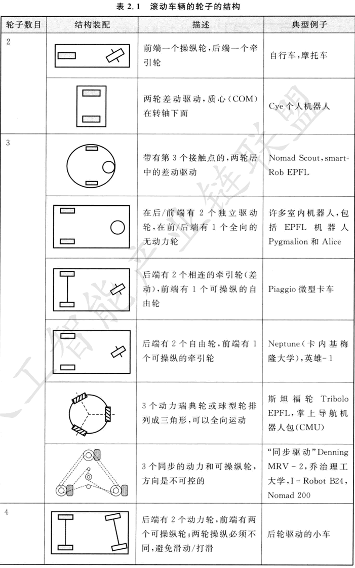 表2.1給出了輪子結(jié)構(gòu)的概貌,按輪子數(shù)目排序。表中描述了特殊輪子類型的選擇和機器人底盤上它們的幾何結(jié)構(gòu)這兩個方面。我們注意到,所示的某些輪子結(jié)構(gòu)在移動機器人的應(yīng)用中很少用到。例如,兩輪自行車裝配,其機動性中等,可控性 差。再像單腿跳躍機,它根本不能靜止地站著。不過,表中提供了在運動機器人設(shè)計 中可能用到的許多種類輪子結(jié)構(gòu)的說明。