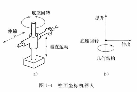 柱面坐標機器人主要由垂直柱子、 水平手臂(或機械手)和底座構成。水平 機械手裝在垂直柱子上,能自由伸縮, 并可沿垂直柱子上下運動。垂直柱子安 裝在底座上,并與水平機械手一起(作 為 一個部件)能在底座上移動。這樣, 這種機器人的工作包跡(區(qū)間)就形成一 段圓柱面,如圖1-4所示。因此,把這種機器人叫做柱面坐標機器人。