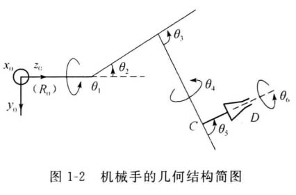 機械手是具有傳動執(zhí)行裝置的機械,它由臂、關(guān)節(jié)和末端執(zhí)行裝置(工具等)構(gòu)成,組合為一個互相連接和互相依賴的運動機構(gòu)。機 械手用于執(zhí)行指定的作業(yè)任務(wù)。不同的機械手 具有不同的結(jié)構(gòu)類型。圖1-2給出機械手的幾何 結(jié)構(gòu)簡圖。機械手又稱為操作機、機械臂或操 作手。大多數(shù)機械手是具有幾個自由度的關(guān)節(jié) 式機械結(jié)構(gòu), 一般具有六個自由度。其中,頭 三個自由度引導夾手裝置至所需位置,而后三 個自由度用來決定末端執(zhí)行裝置的方向。