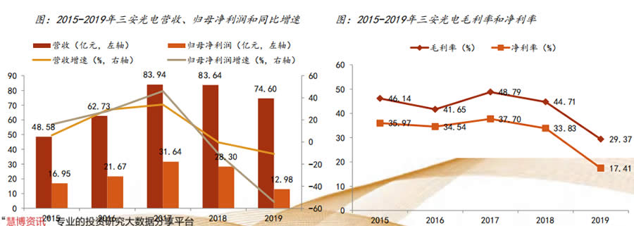 公司是LED芯片龍頭,重點(diǎn)投資Ⅲ-Ⅴ族化合物半導(dǎo)體,子公司三安集成2019年實(shí)現(xiàn)銷售收入 2.41 億元,同比增長 40.67%。砷化鎵射頻出貨客戶累計(jì)超過 90 家,客戶地區(qū)涵蓋國內(nèi)外;氮 化鎵射頻產(chǎn)品重要客戶已實(shí)現(xiàn)批量生產(chǎn),產(chǎn)能正逐步爬坡;電力電子產(chǎn)品推出的G功率密度碳化 硅功率二J管及 MOSFET 及硅基氮化鎵功率器件主要應(yīng)用于新能源汽車、充電樁、光伏逆變器等 電源市場,客戶累計(jì)超過 60 家,27種產(chǎn)品已進(jìn)入批量量產(chǎn)階段;光通訊業(yè)務(wù)產(chǎn)品主要應(yīng)用于光 纖到戶,5G 通信基站傳輸及消費(fèi)類終端的3D感知探測等應(yīng)用市場,光通訊在保持及擴(kuò)大現(xiàn)有中 低速 PD/MPD 產(chǎn)品的市場L先份額外,在附加值G的G端產(chǎn)品如 10G APD/25G PD、以及發(fā)射端 10G/25G VCSEL 和 10G DFB 均已在行業(yè)重要客戶處實(shí)現(xiàn)驗(yàn)證通過,進(jìn)入實(shí)質(zhì)性批量試產(chǎn)階段; 濾波器產(chǎn)品開發(fā)性能優(yōu)越,生產(chǎn)線持續(xù)擴(kuò)充及備貨中,預(yù)計(jì) 2020 年會(huì)實(shí)現(xiàn)銷售。