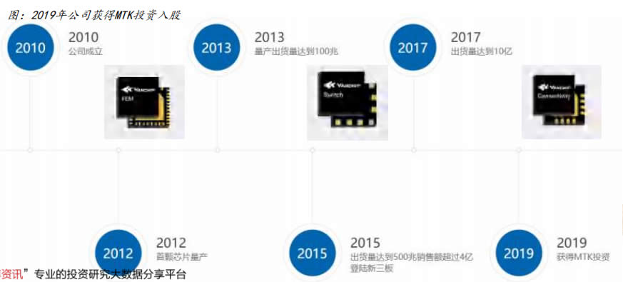 公司以射頻開關(guān)、LNA芯片起家,實(shí)現(xiàn) L先手機(jī)品牌如三星、小米、華為、vivo、OPPO等重點(diǎn)客戶覆蓋,并在2019年實(shí)現(xiàn)射 頻模組產(chǎn)品從無到有的突破。在細(xì)分產(chǎn)品中,比較優(yōu)勢明顯,射頻開關(guān)已通過G通的小批 量試產(chǎn)驗(yàn)證,正式進(jìn)入量產(chǎn)。DiFEM的成功研制是公司技術(shù)創(chuàng)新的又一里程 碑,打破了海外寡頭在射頻模組L域的壟斷局勢。站在當(dāng)前時(shí)點(diǎn),公司營收體量小,所處 賽道面向250億美元市場,具備5G換機(jī)潮和射頻芯片國產(chǎn)替代的雙重彈性。