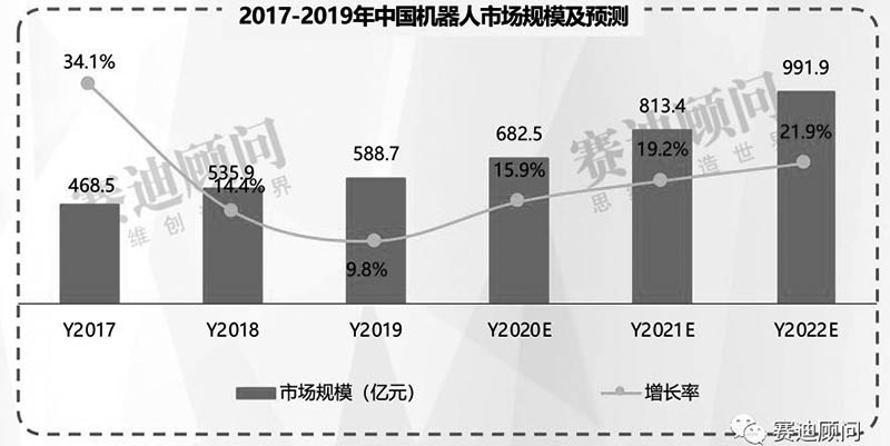 2019年,中國(guó)機(jī)器人市場(chǎng)規(guī)模持續(xù)增長(zhǎng),達(dá)588.7億元,增長(zhǎng)率為9.8%,預(yù)計(jì)到2022年,市場(chǎng)規(guī)模將達(dá)到991.9億元,2020-2022三年復(fù)合增長(zhǎng)率為19.0%。