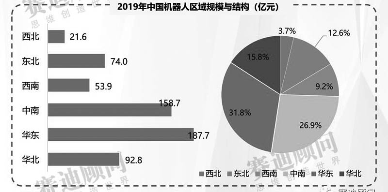 2019年,華東、中南、華北地區(qū)是中國(guó)機(jī)器人發(fā)展較好的區(qū)域市場(chǎng),市場(chǎng)份額分別達(dá)到31.8%、26.9%和15.8%。隨著機(jī)器人的應(yīng)用場(chǎng)景不斷擴(kuò)大與滲透,東北、西南、西北地區(qū)機(jī)器人市場(chǎng)規(guī)模呈現(xiàn)增長(zhǎng)趨勢(shì),市場(chǎng)份額將進(jìn)一步提升。