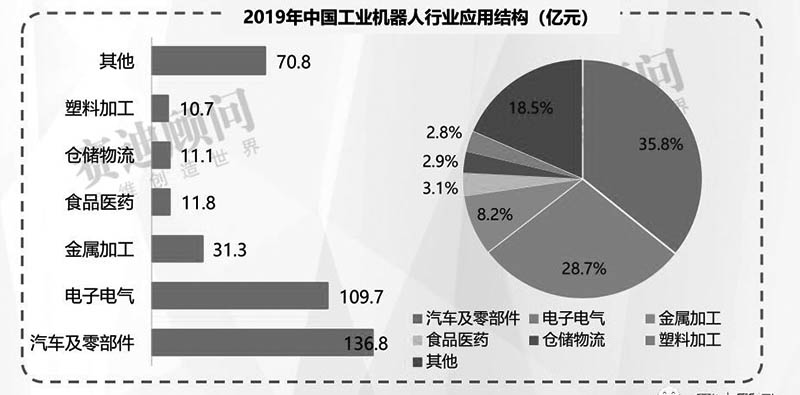 2019年,汽車及零部件在中國工業(yè)機器人市場的行業(yè)應用占比為35.8%;電子電氣占比為28.7%;金屬加工占比8.2%;食品醫(yī)藥占比3.1%;倉儲物流占比2.9%;塑料加工占比 2.8%;其它L域占比18.5%。